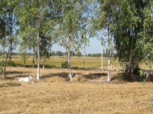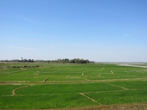 The dirt road winds through beautiful rice fields. There are always people working in the fields.
