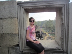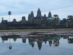 Sadly, the next day, Jay was still not feeling well enough to go to the Angkor Temples. Thankfully, Kate wanted to go that day as well, so we went together. The best part was being there for sunrise, and getting to see Angkor Wat emerge from the darkness as the sun came up. Although it was not a colorful sunrise, it was quite beautiful to see the sunlight bring the temple to light and create a stunning reflection on the water.