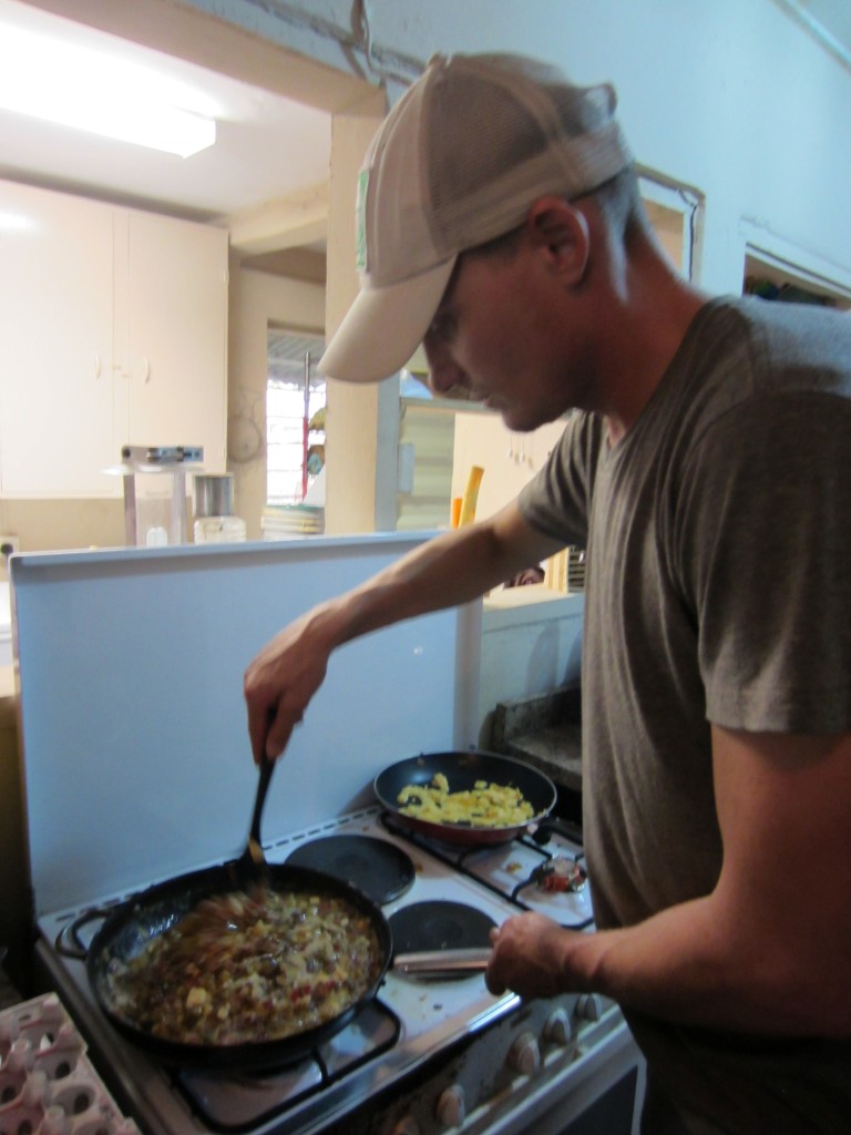 On Sunday mornings the kitchen staff is off. One Sunday, Jay offered to cook breakfast for everyone. He made an egg scramble, using the ingredients he could find in kitchen. It was delicious!