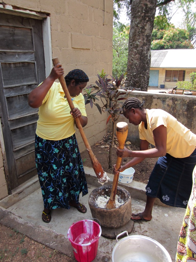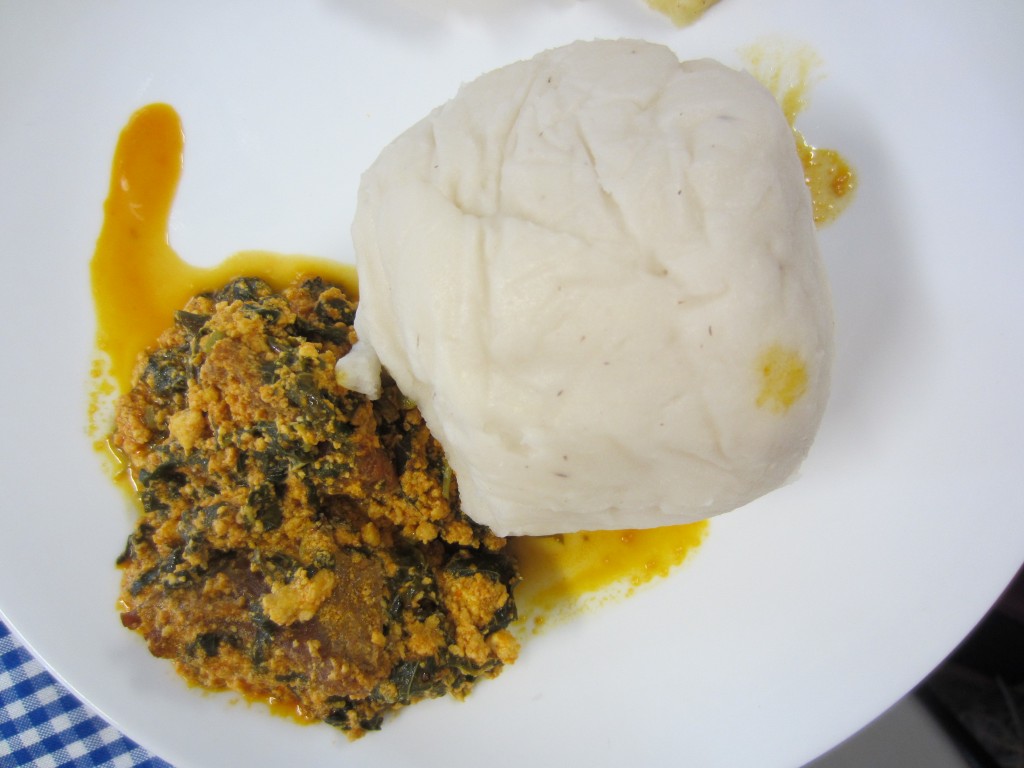 A typical Nigerian meal is rice and beans with red sauce. Another typical meal is pounded yam. The yams here are big and white. They boil the yams, then pound them in a large pot. The yams themselves don’t have much flavor, but you eat them with egusi soup, which is quite flavorful (vegetables with sauce and spices).