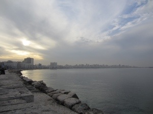 It turned out to be a good decision. There was a more relaxed vibe in Alexandria. I was very different than the other parts of Egypt we visited; in some ways, it was more Mediterranean than Middle Eastern. The main stretch of Alexandria along the water is known as the Corniche. We stayed at a hotel on the Corniche and had a nice view of the Mediterranean from our room’s balcony. Some shots we took from the balcony…