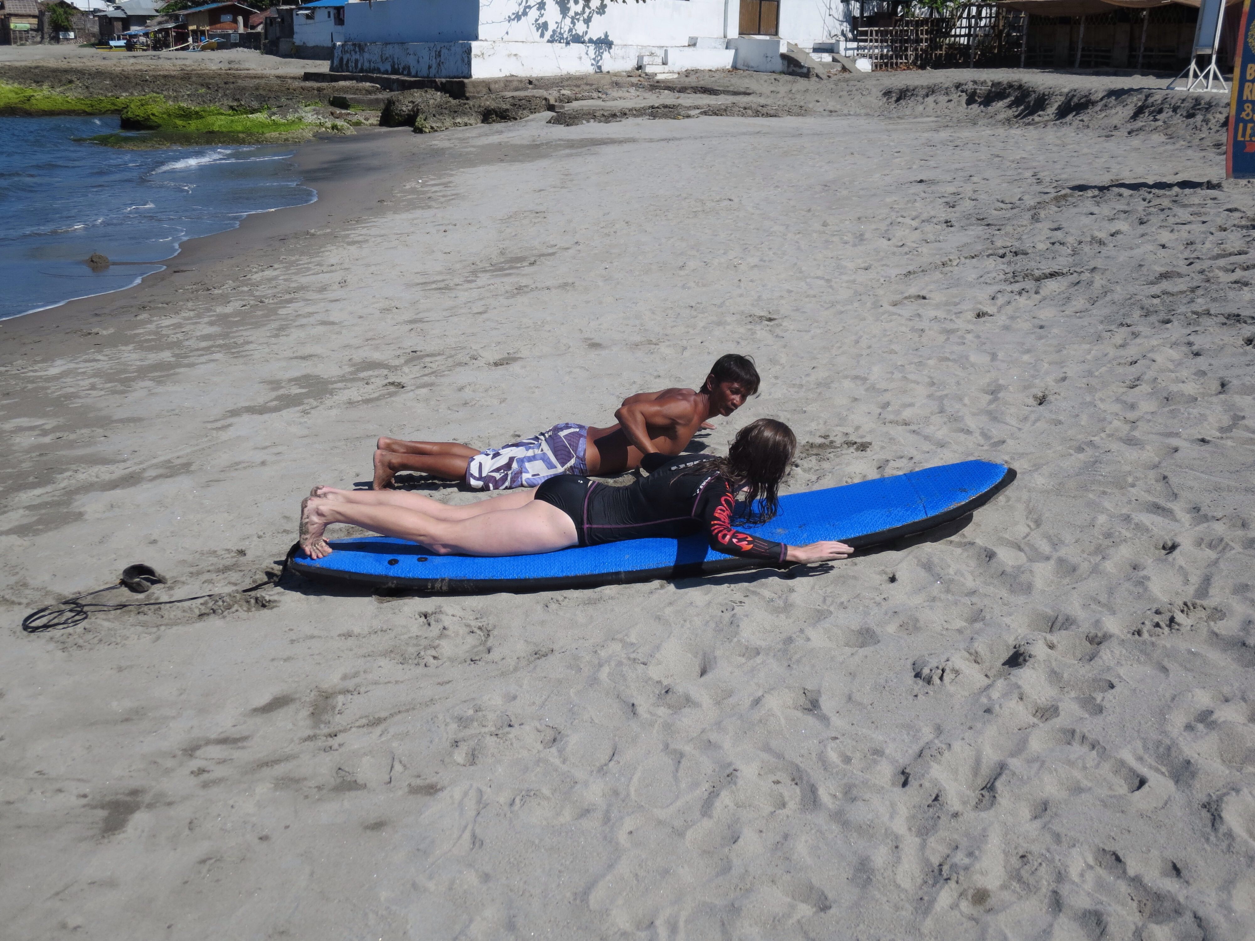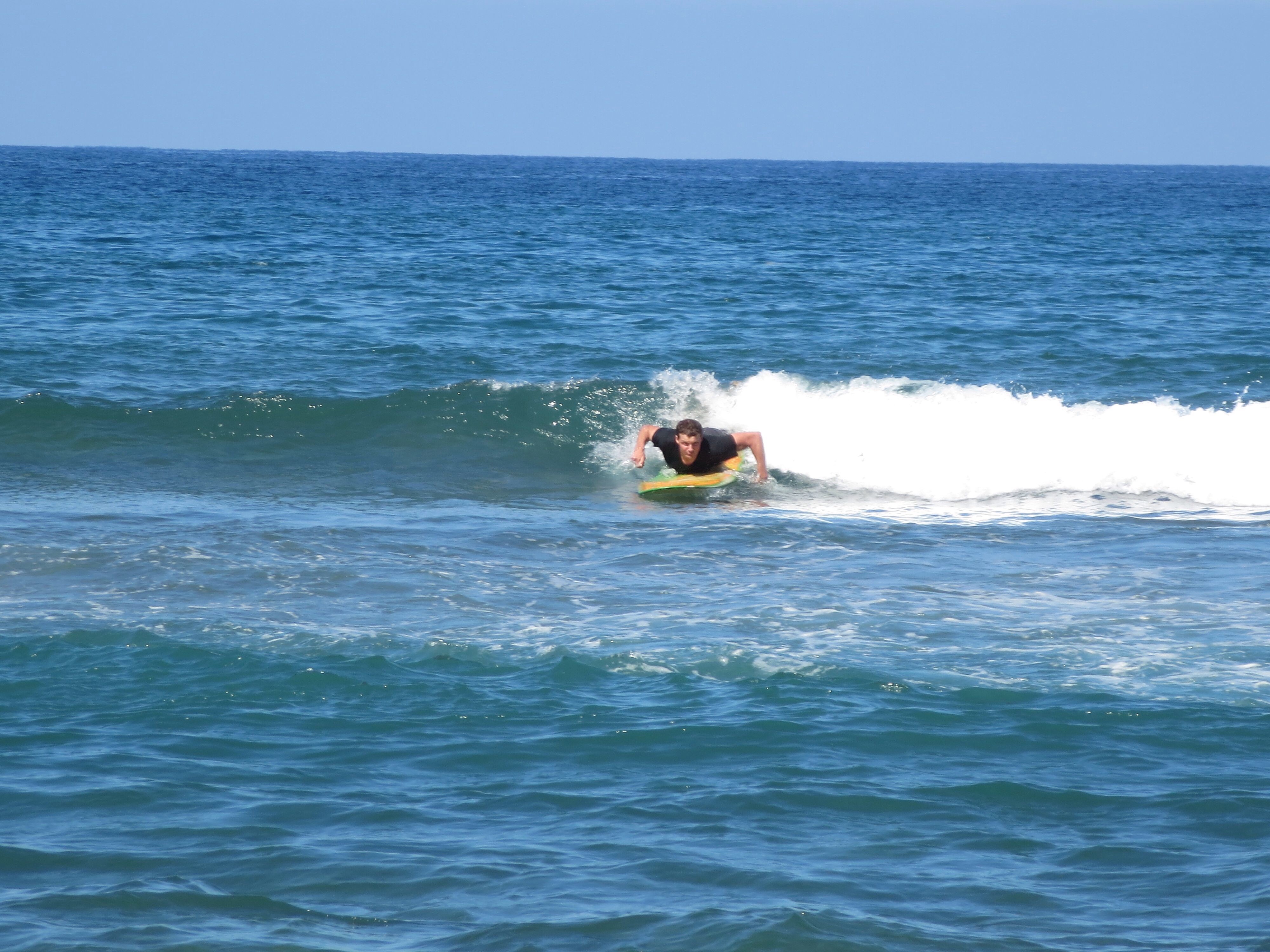 I was a bit afraid about surfing being painful with all the body contact with the board. I was also afraid of losing a toenail in the process (I had one about to fall off on my right foot). But, I decided that I couldn’t let those fears hold me back. I was at a premier spot for surfing and there was no way I was going to pass up the opportunity to try it. My lesson started with an overview of the basics while still on the beach. I learned the proper positioning on the board, the different ways to pull yourself up to standing position, the correct way to jump off the board so it doesn’t hit you in the head, etc.
