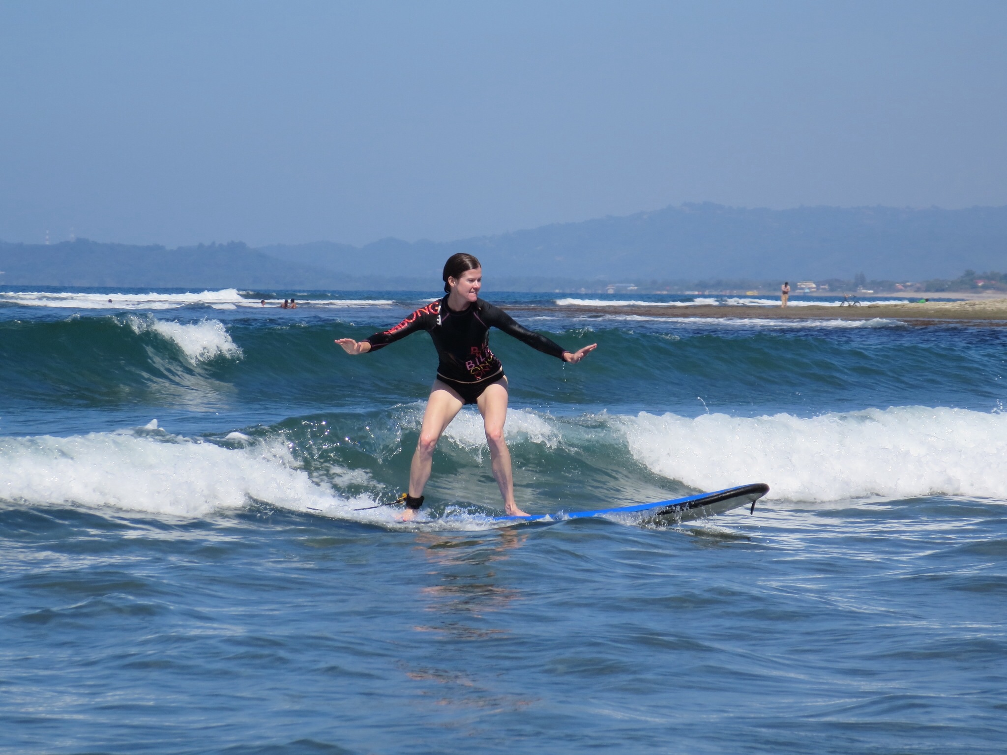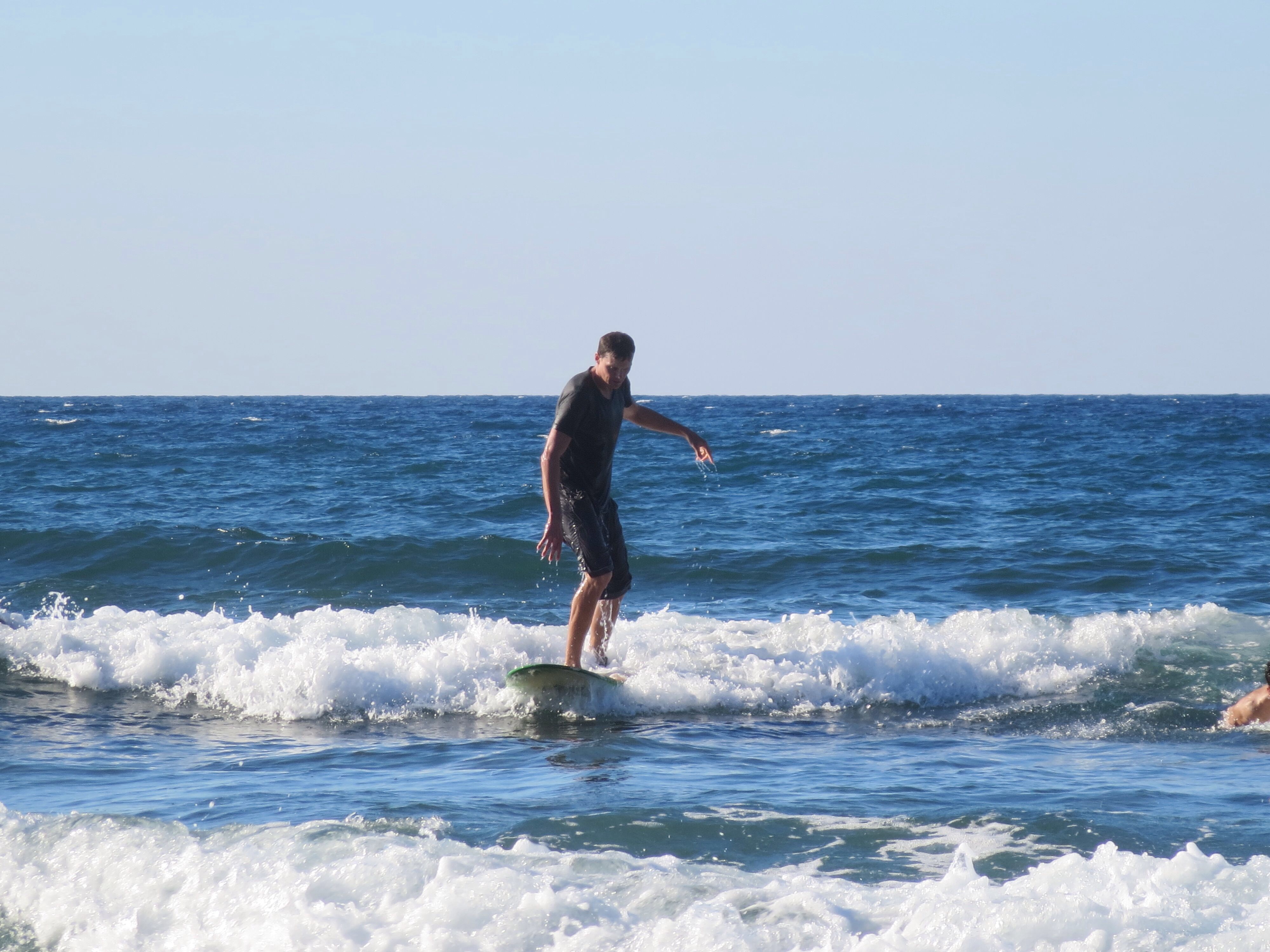 Surfing turned out to be more of a workout than I anticipated. It takes quite a bit of core strength. You start by laying on your belly. Then, you paddle hard with your arms (the smaller the waves, the harder you need to paddle). Once you feel the momentum of the wave behind you, you pull yourself up. I used the method of stepping with my right foot then left foot to get to standing position. Once up…you just stay balanced and enjoy the ride.