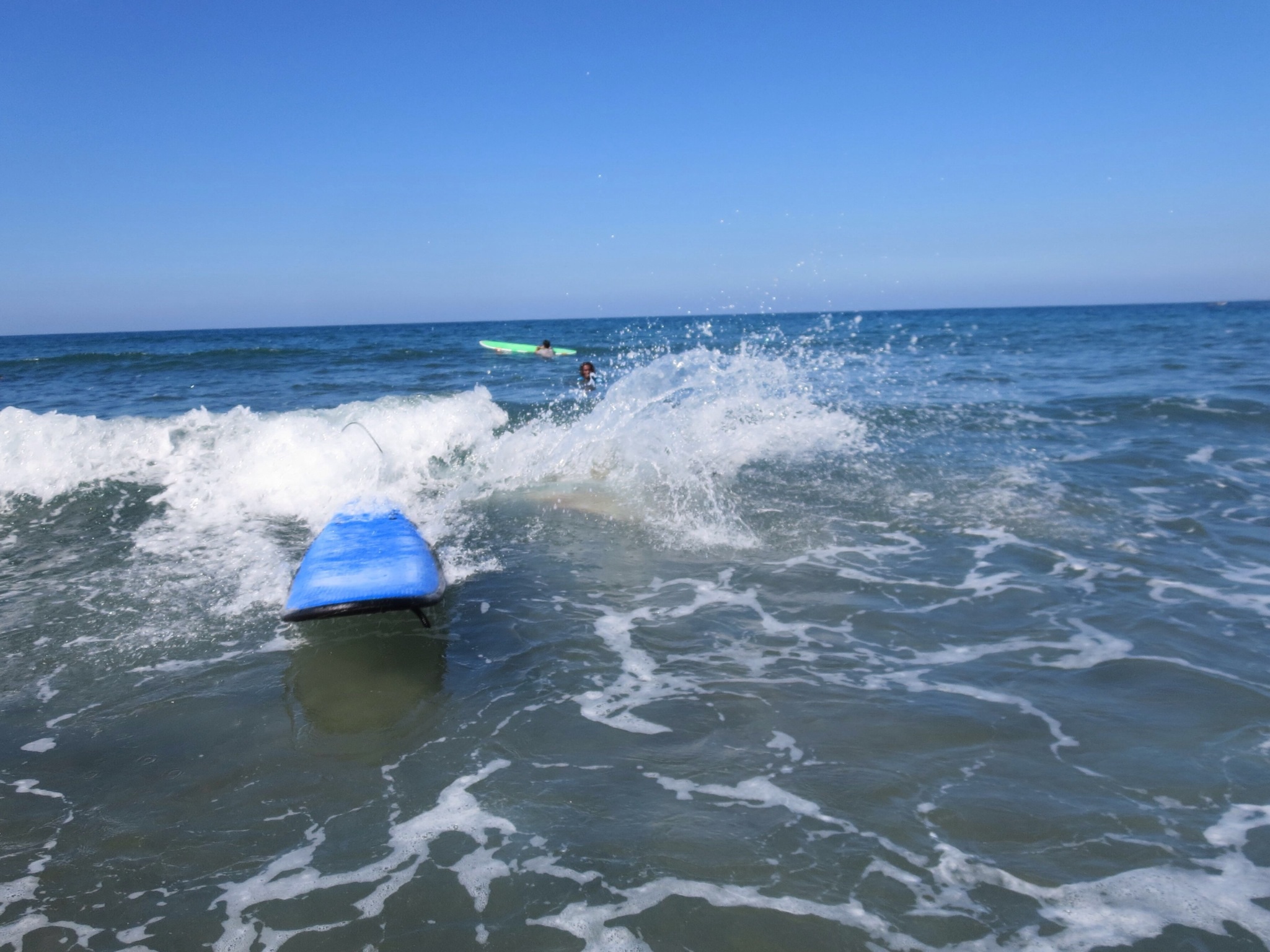 The instructor was out in the water with me throughout the lesson. He helped me spot when a good wave was coming and to know when to get into position and start paddling. He gave me pointers in between waves. I was getting up on nearly every try, I could hardly believe it! In full disclosure, I was on a beginner board which was really long with a padded grip lining on top. But, at the same time, maybe I was channeling some long-lost genetic inheritance from my dad who was surfer back in his California days?