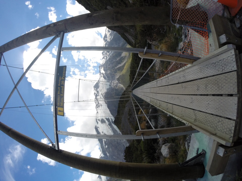 When we arrived at the park, it was warm and sunny, but a storm was just starting to blow in. Not wanting to waste any time while the weather was still nice, we quickly set off to hike the Hooker Valley Track. The track leads up Hooker Valley towards Mt Cook. One hundred years ago, the entire valley was a glacier; now, you hike three miles through the valley before you see the edge of Hooker Glacier. It’s a beautiful hike; I’d consider it a “must-do” if you visit the park. From the campground trailhead, the hike takes about three hours round-trip. The trail is pretty flat, so easy on the legs, yet the views are sensational. As an added bonus, the trail crosses over three suspension bridges (called swing bridges in NZ).