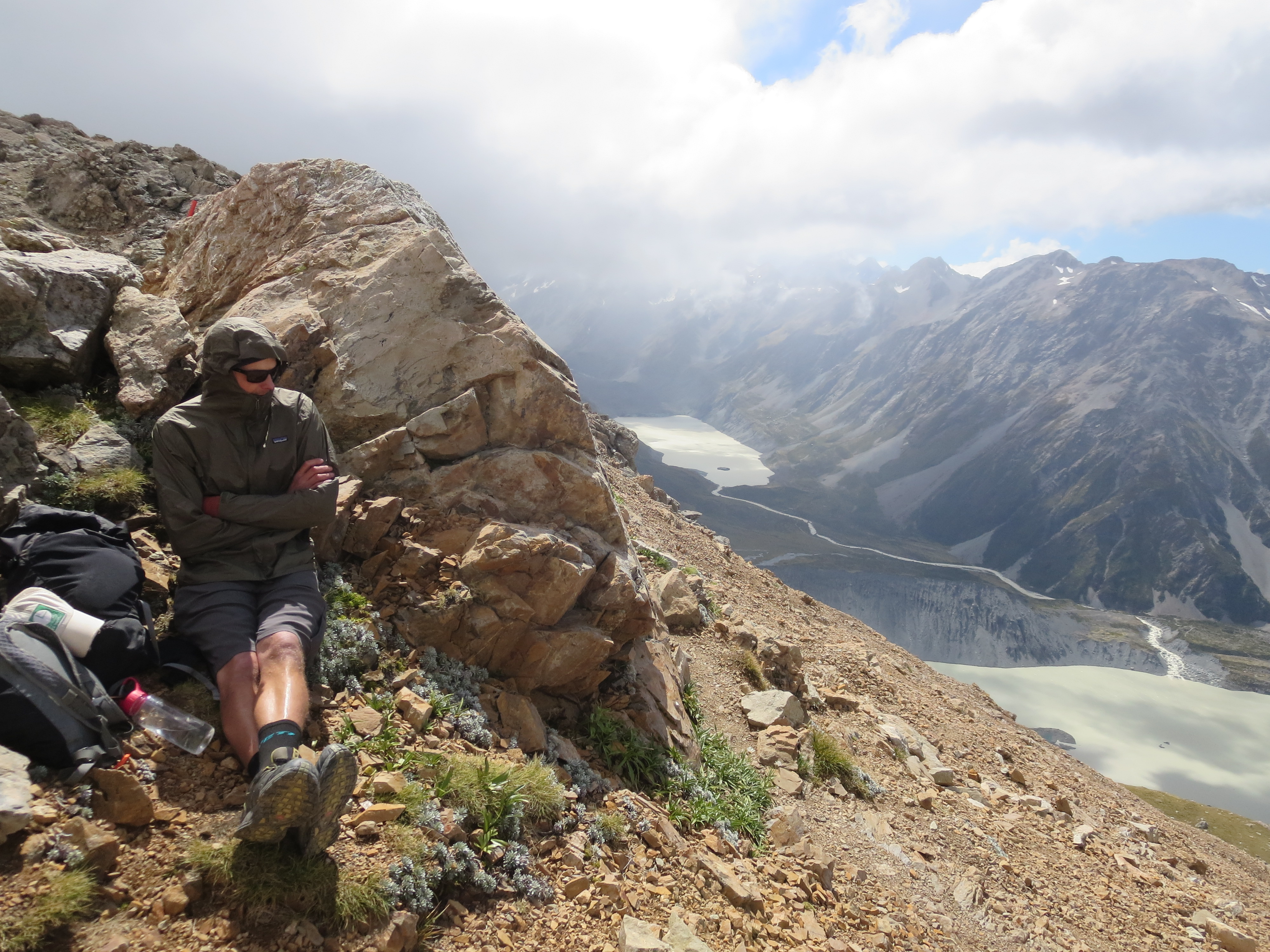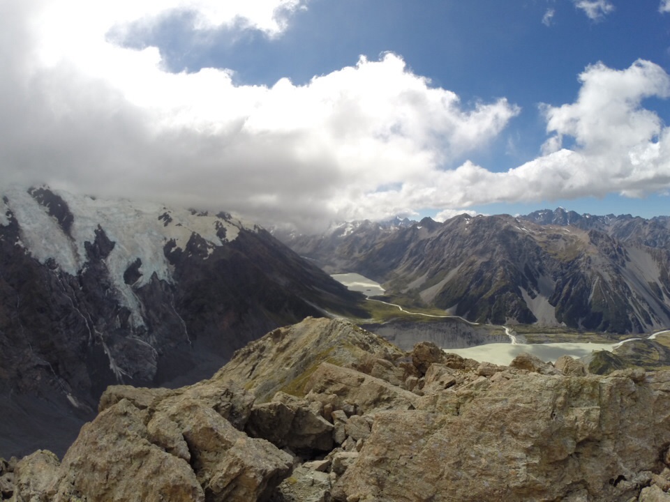 After our short break, we hiked along the ridge to a lookout with sweeping views of the surrounding mountains and glaciers. The Mueller Glacier was in the foreground, and four smaller glaciers ran down the mountainside.