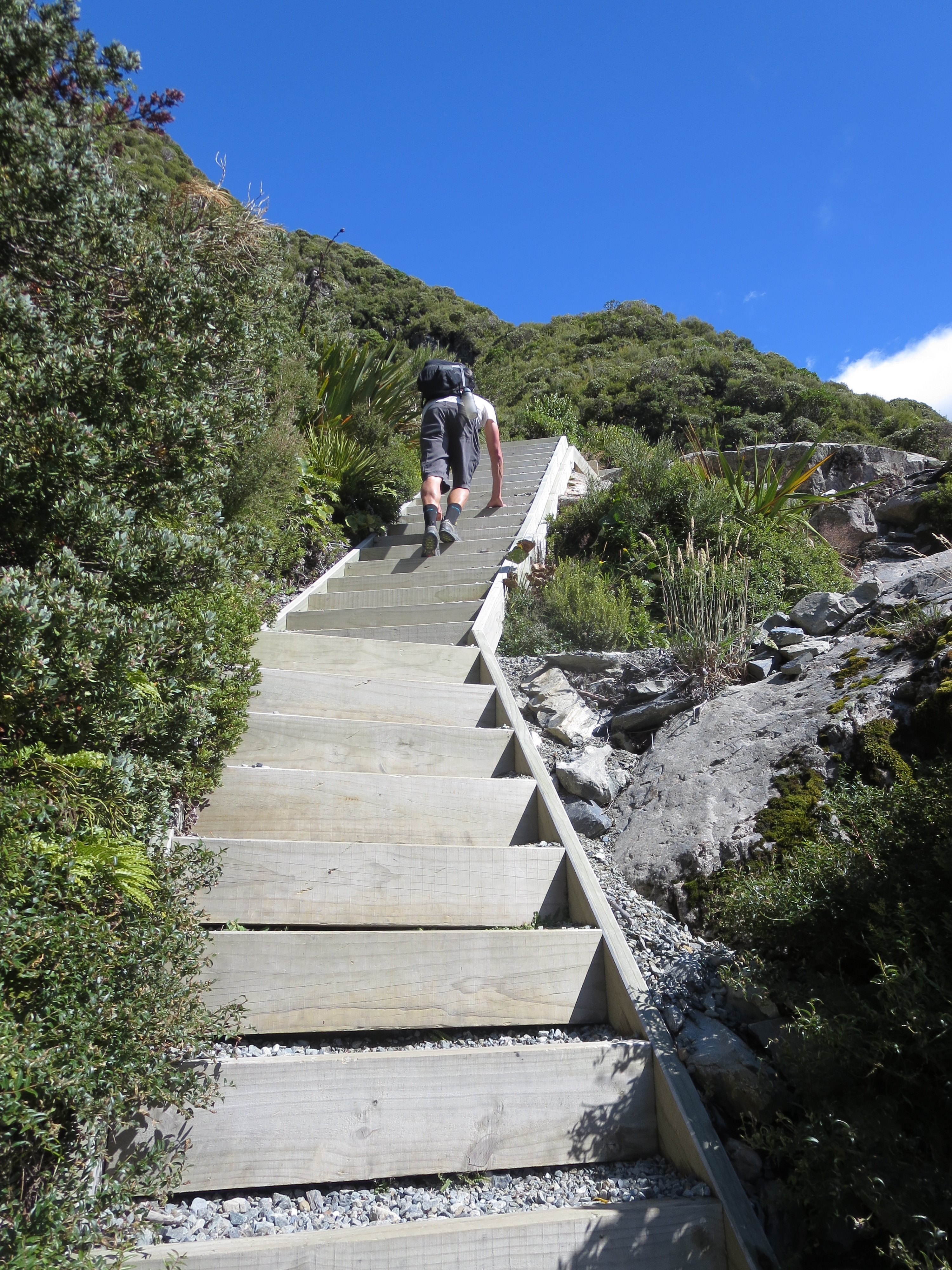 After the Kea Point lookout, the track reaches the foot of the Sealy Range and that is where the steep climbing begins. The first stretch of climbing is up stairs. The stairs have been nicknamed the “Stairway to Heaven”. It’s definitely a quad burner as you make your way up, but it is all worth it for the views.
