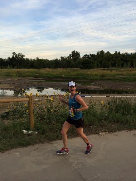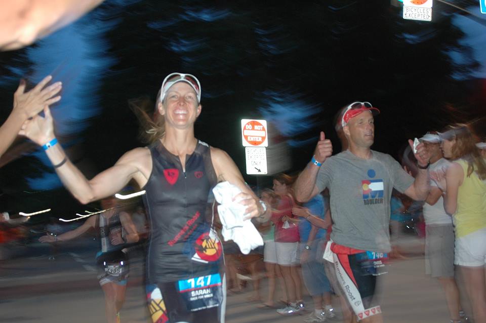 I walked my bike to T2, and gladly handed it off to one of the many volunteers waving there arms, ready to take it from me. I looked down at my watch. I’d spent 7.5 hrs on the bike course. It had taken me longer than I’d anticipated. It was now about 4:15 in the afternoon. T2 was a long transition. We had to walk from Boulder High School to the track, and then walk the length of the track to the changing tents at the far end. In the changing tent, I again had my own personal volunteer to help me transition to the run. As she pulled out my running shoes, I told her how happy I was to see them. “I’m a runner”, I told her. I’m ready to run. It was at this moment, I knew I would finish the Ironman. I had enough time to make it to the finish line even if I had to walk the entire marathon. I was wearing a running tank that said, “run happy”. And man, was I running happy. The first several miles were a gradual downhill and I felt brand new. The pain in my stomach had subsided. I came up on my friend Orla, who reminded me to save some for mile 18. Good point. It was so hard to hold back when I finally felt strong, but knew I still had an entire marathon before me, so I’d better save some for later. About one mile in, I ran past my mom and friends Christine, Lauren, and Andrew. They commented on how great I looked and that made me feel even better. I was all smiles.