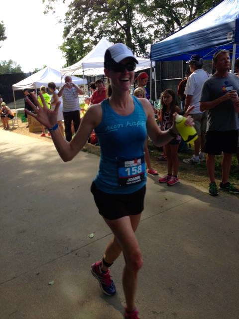 About 30 miles into the bike, my stomach started cramping. I was mentally prepared for this to happen on the run, but not on the bike and not this early in the race. I slowed down my fluid intake and my pedaling. I positioned my body as upright as possible, hoping it would help if I weren’t crouched over. I told myself to hang in there until the 56 mile point, where I would get my special needs bag, and hopefully I had Pepto-Bismol in there. At this point, I couldn’t remember for certain. When I reached special needs, the volunteer held open the bag before me and I looked in disbelief – no Pepto. I asked around, but no one had any. Major bummer. Mind over matter, I told myself. I continued my slow pace and carried on. The whole middle stretch of the bike became a blur. Around mile 75, as I shifted gears up a steep hill, my bike chain came off. I tried to fix it on the hill, but it was too hard – so I walked my bike up the hill and fixed it when I got to the top. My hands were now covered in black grease. Please, please, bike…just get me through these next 35+ miles without any more issues. Miles 80-90, my stomach pain let up some and I picked up the pace. It felt so good to finally start passing people after such a long stretch of getting passed so many times. Around mile 90, the course headed directly into the sun. At this point, it was early afternoon and it was so hot. At mile 95, still heading directly into the sun and now going uphill, I felt myself starting to get light headed. On this stretch, I passed two athletes laid down on the side of the road getting medical attention. There were others stopping to take a break where there were patches of shade. The combination of the bright sun (not in a cloud in sight) and the heat was brutal. I remember my coach telling me that there would be several times during the day when I would struggle and have to push through – this was one of them. At mile 100, I came to the 3 dreaded hills – relatively short, but steep. I am so thankful that there were spectators camped out at each one cheering us on. They knew just what to say to help get us up those hills (things like “this hill’s never had its butt kicked like this before!”). Those spectators were a godsend. A few miles later, I reached the final aid station. I had stopped at each aid station along the way and made one last stop at this one. I dumped ice down my jersey and it was just what I needed to perk back up. With less than 10 miles to go, I knew I would make it. And, I knew that if anything went wrong with my bike at this point, I was closer to town and there would be more people around to help. The final stretch was a nice downhill on Folsom and I was flying. Tears started streaming down my face. I was going to make it to the run! I had so many fears about the swim and bike, but the run was my comfort zone and I was almost there! As I reached the bike dismount, Jay was there – which was a really nice surprise. I could not wipe the smile from my face.
