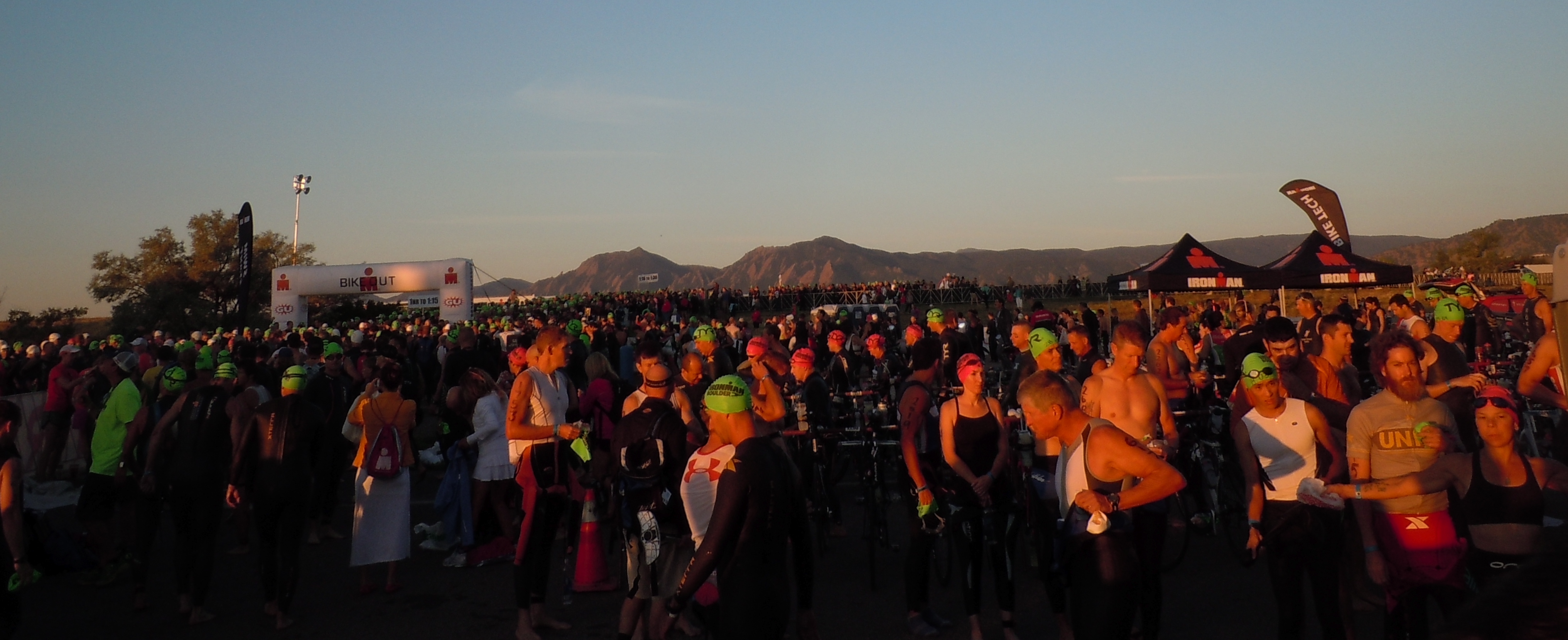 First order of business was fueling. As soon as I woke up, I ate a banana and started sipping on 20 oz of my EFS/CarbPro drink. I also had a bowl of oatmeal. After eating and getting dressed, we were out the door a little after 3:30AM. I was surprised to feel an overwhelming sense of calm. I heard a voice in my head saying “you are ready” and for the first time, I believed it. We arrived at Boulder High School just before 4AM. I dropped off my bike special needs and run special needs bags, and then we loaded the shuttle buses. By pure luck, we ran into Carrie on the way to the bus and we were able to ride on the same shuttle together. On the way to the Boulder Reservoir, our shuttle driver got lost. And I thought – if this is the only thing that goes wrong today, I’ll take it. Upon arriving at the Boulder Reservoir, first order of business was body marking. Afterwards, my mom and I said our goodbyes, and I headed to the transition area.