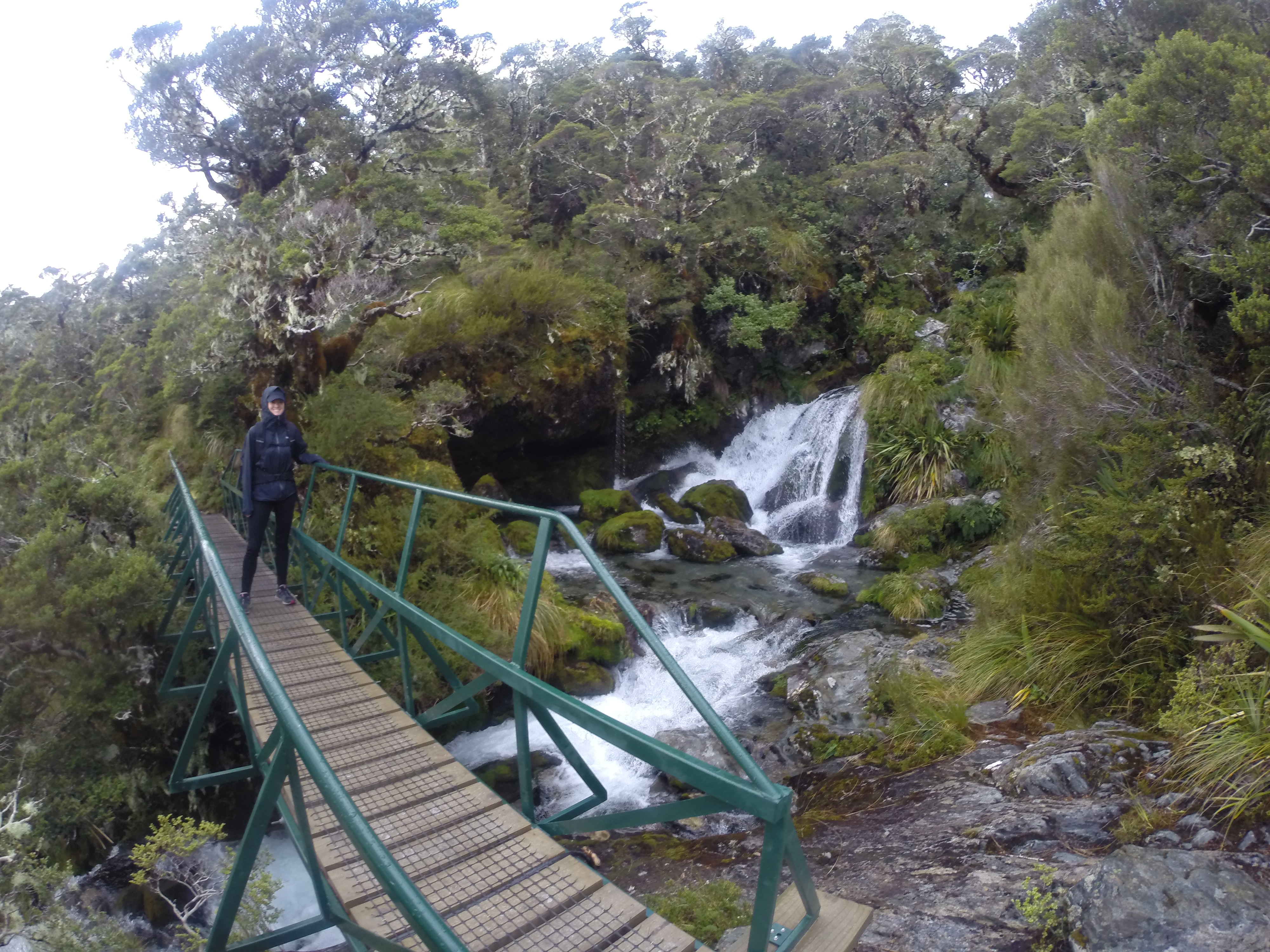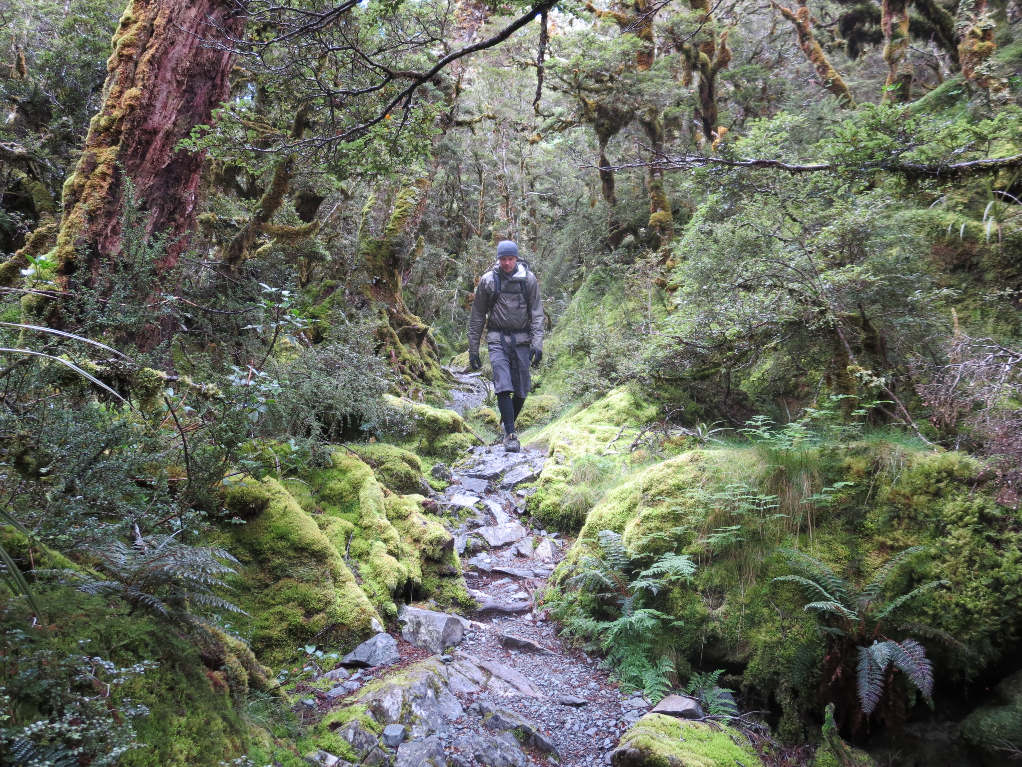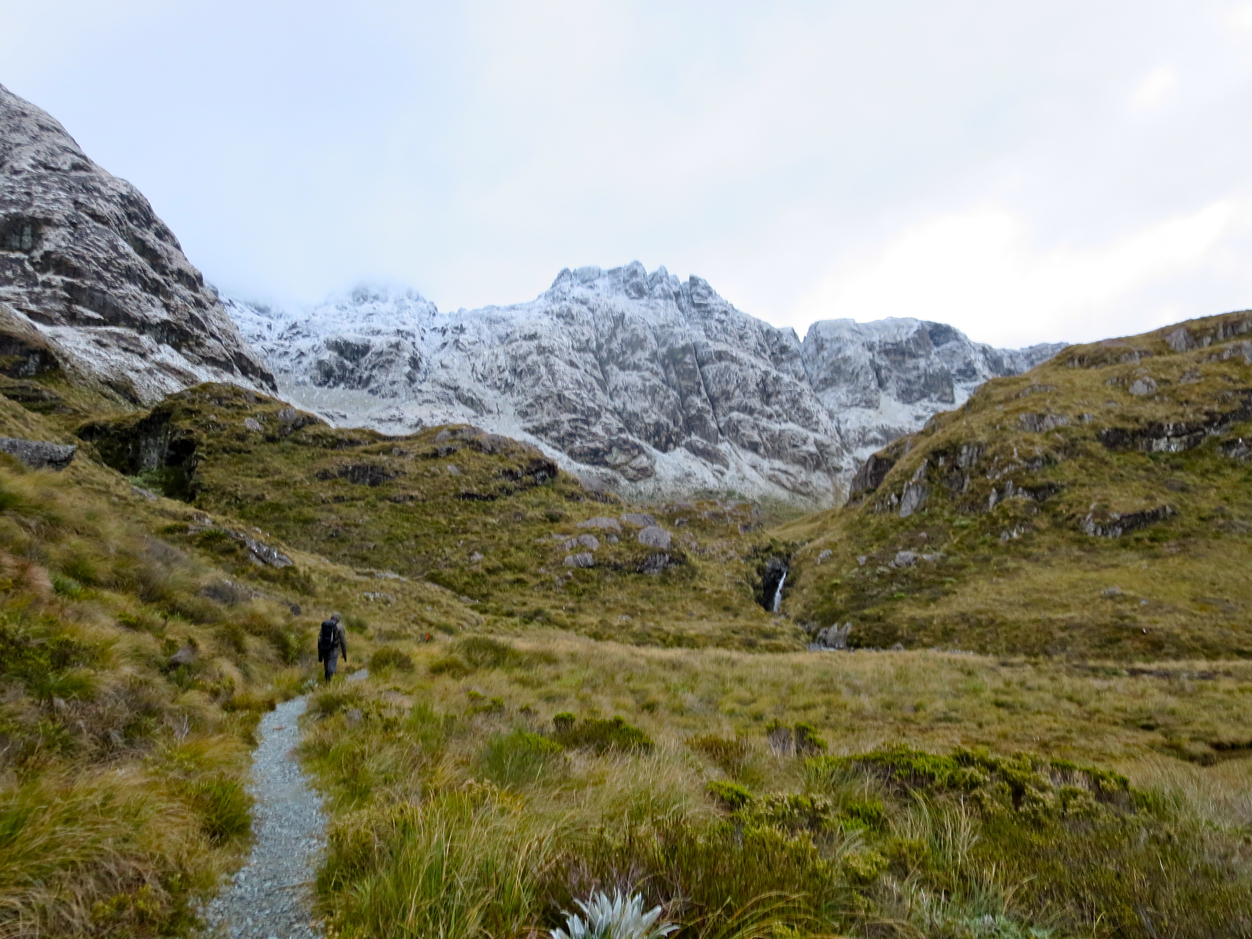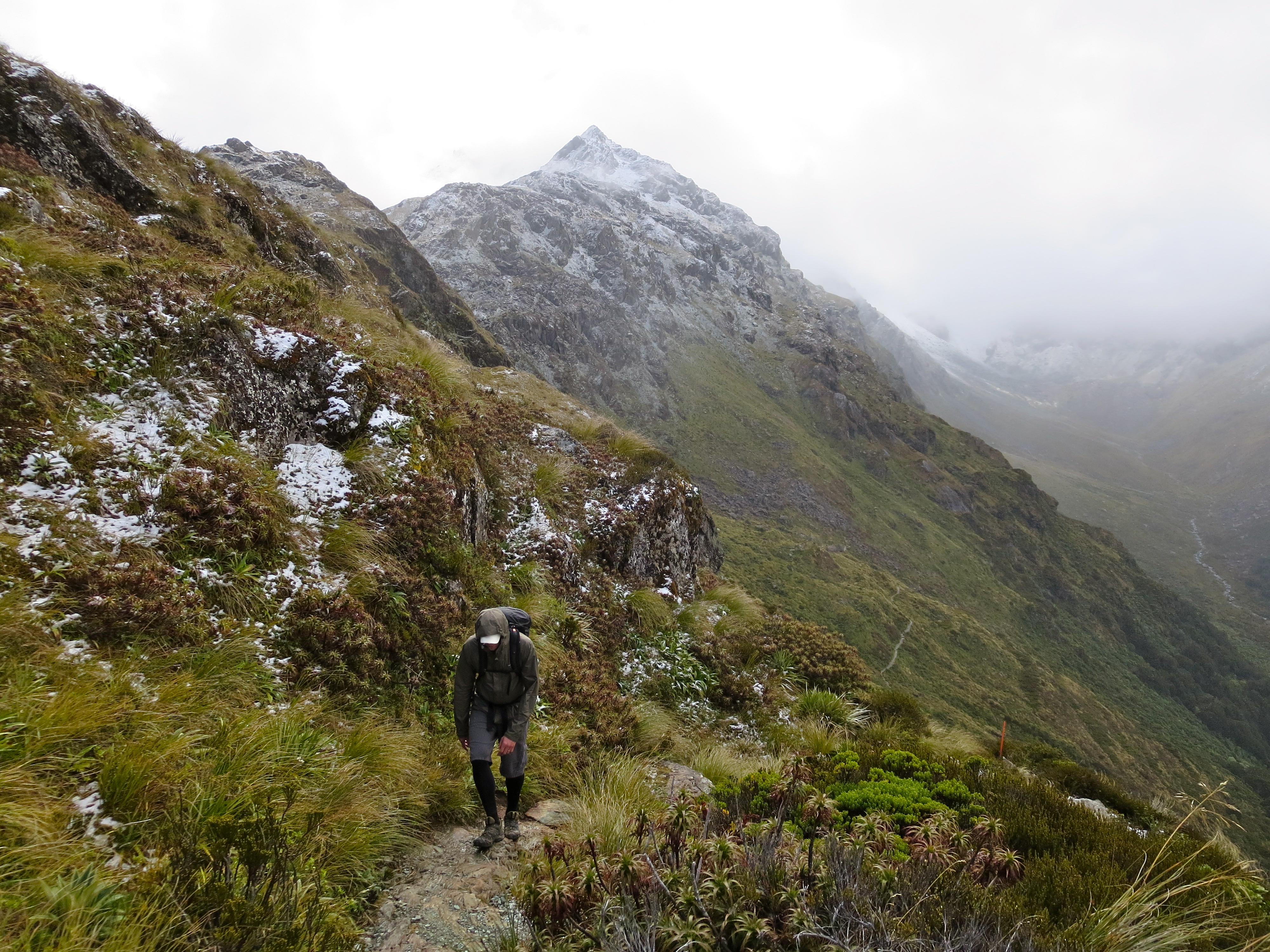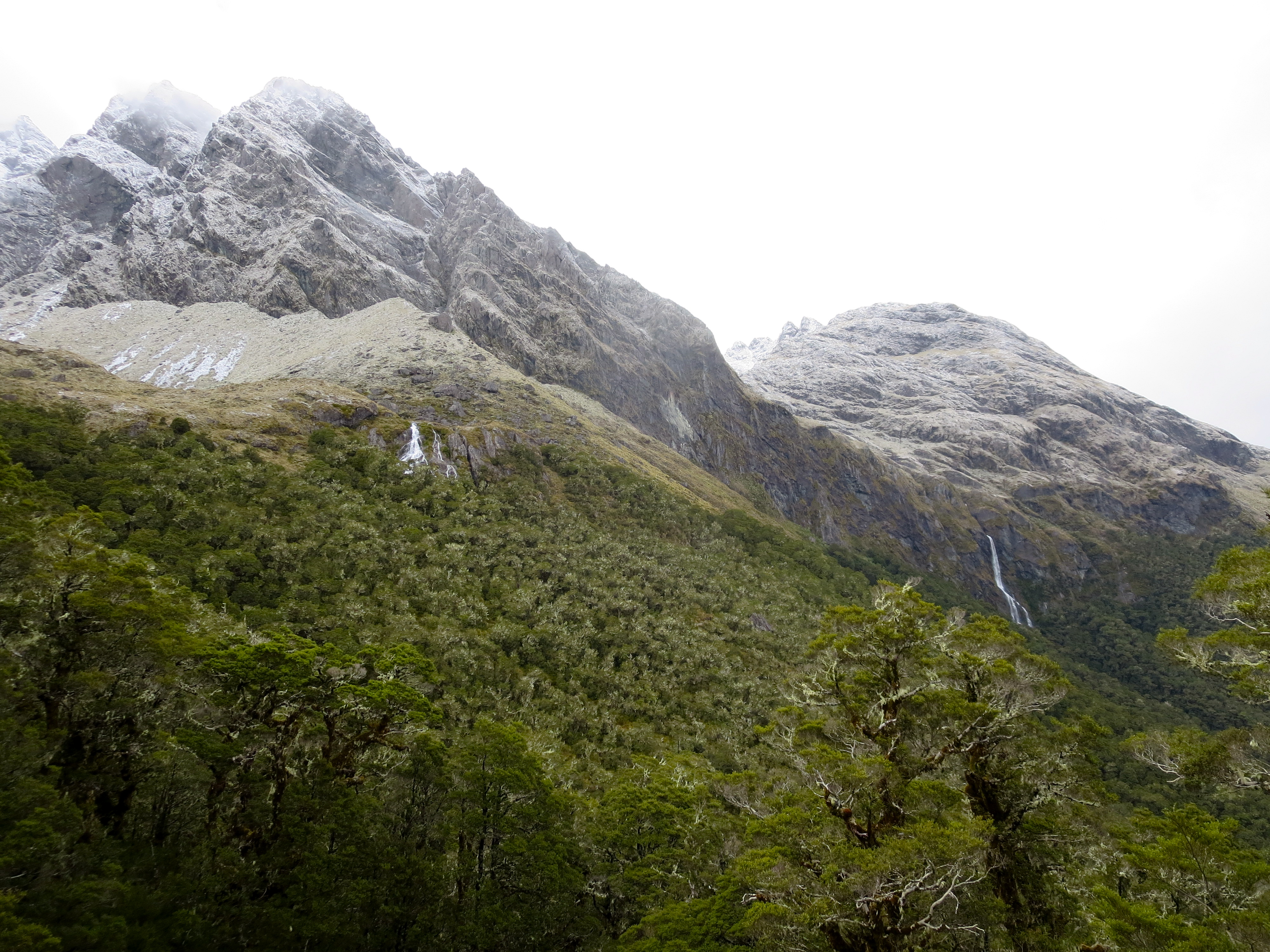 By the time we got parked and on the trail, it was 8AM. The forecast for the day was grim. When we picked up our hut tickets, we were warned it could be blizzard conditions above tree line. No doubt it had snowed quite a bit overnight as fresh snow-covered all the peaks along the road from Milford Sound. It wasn’t raining or snowing as we started the hike.