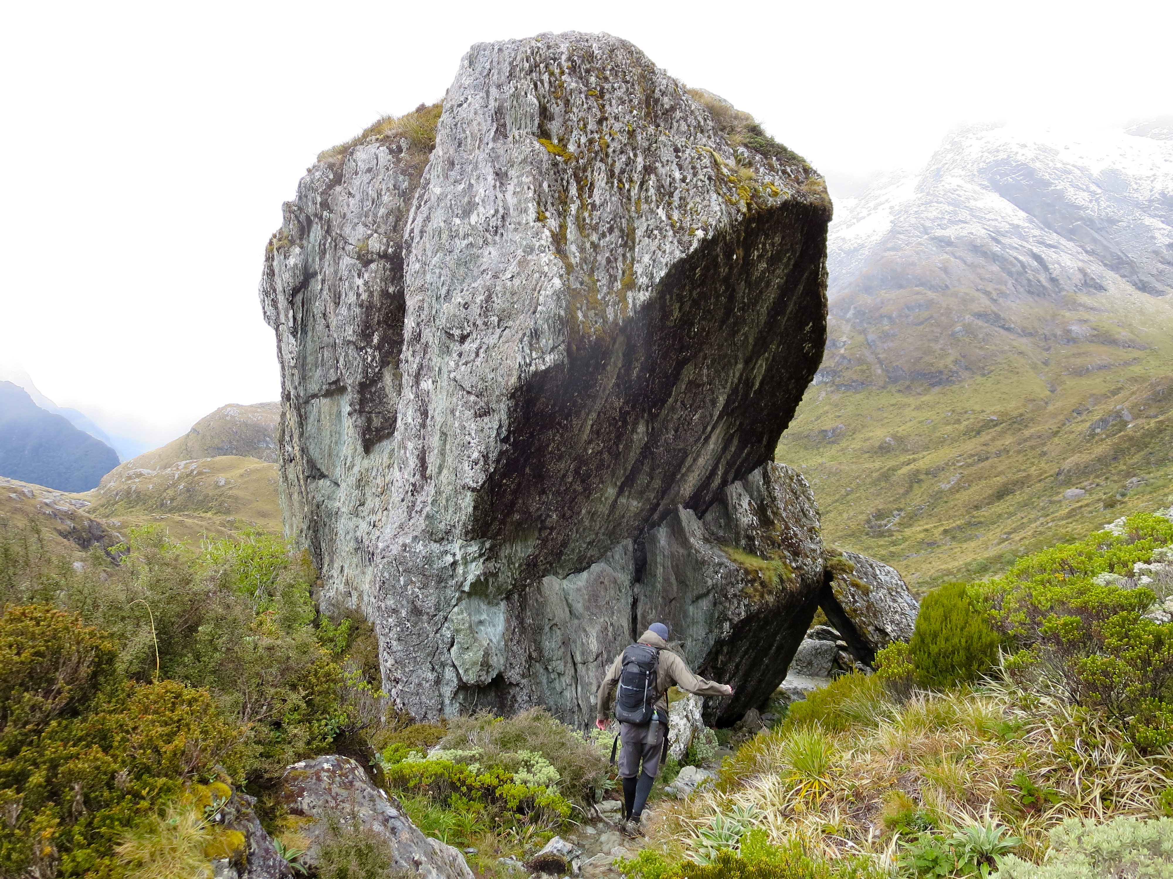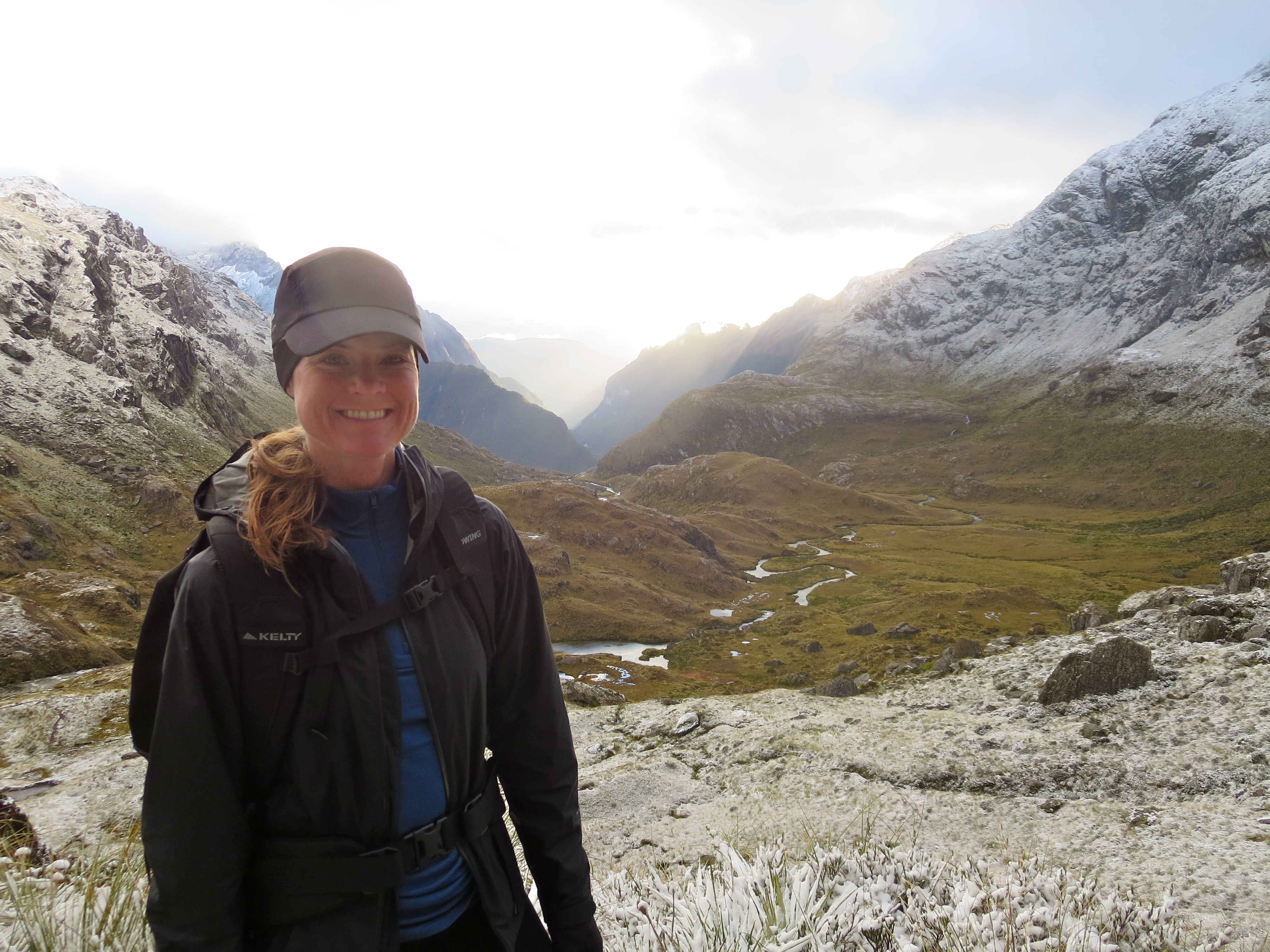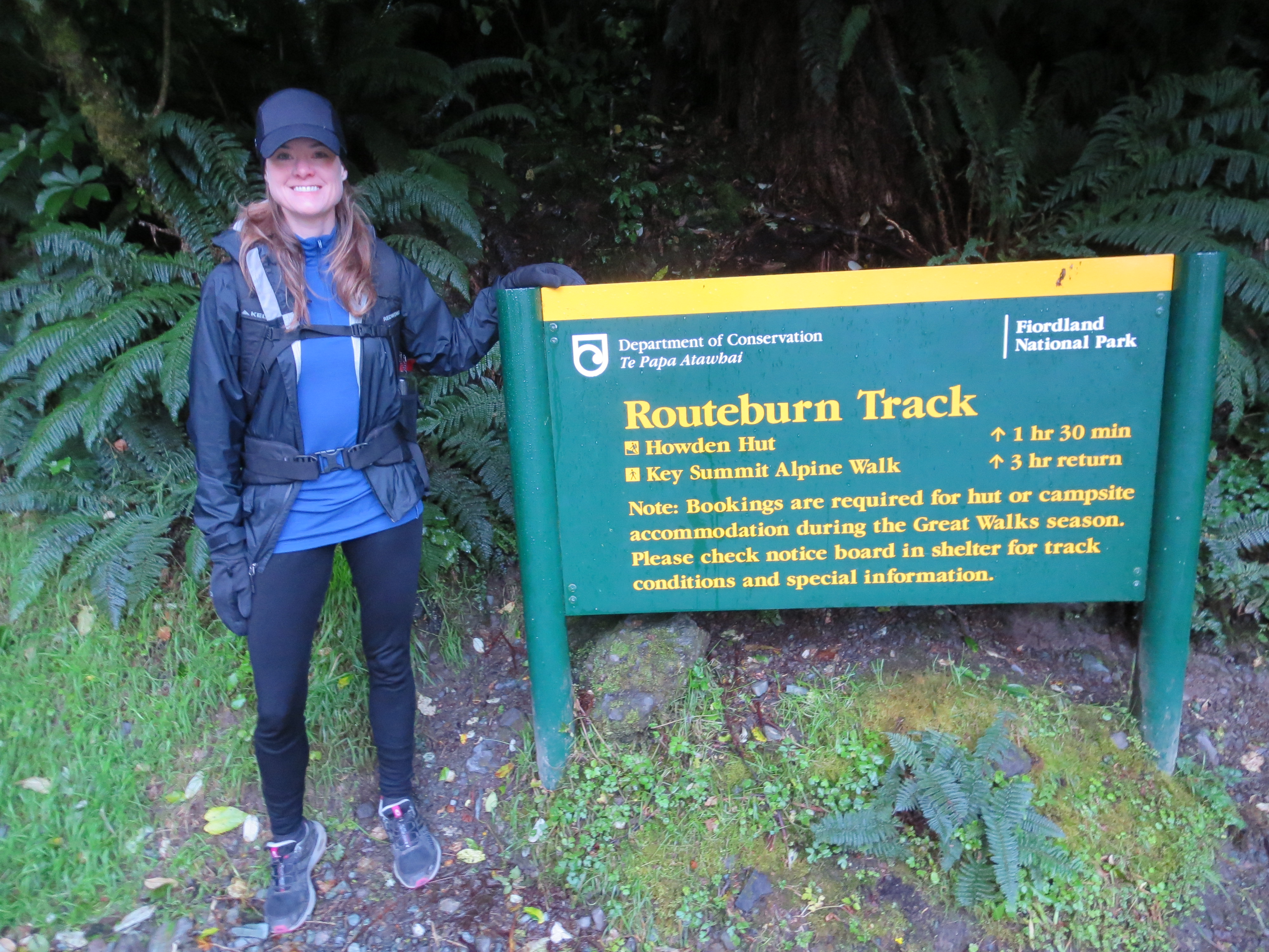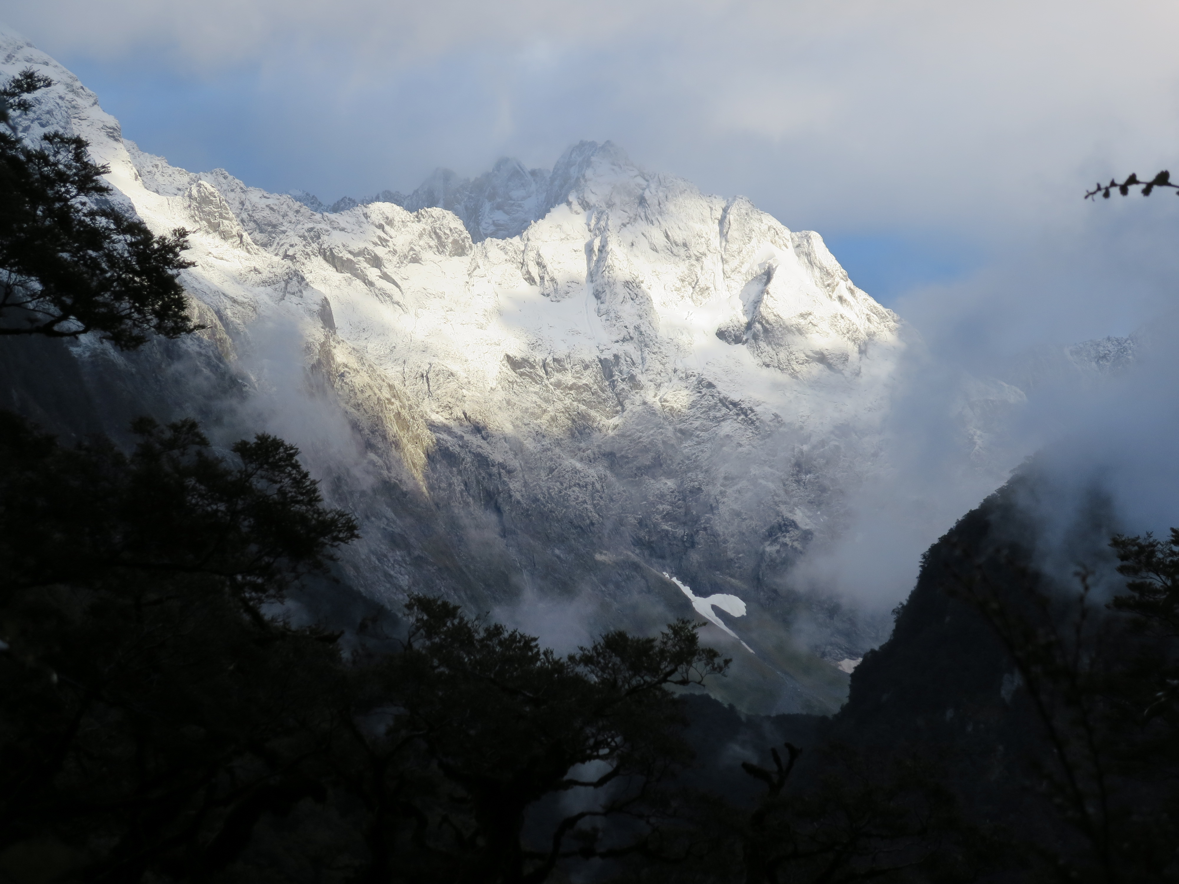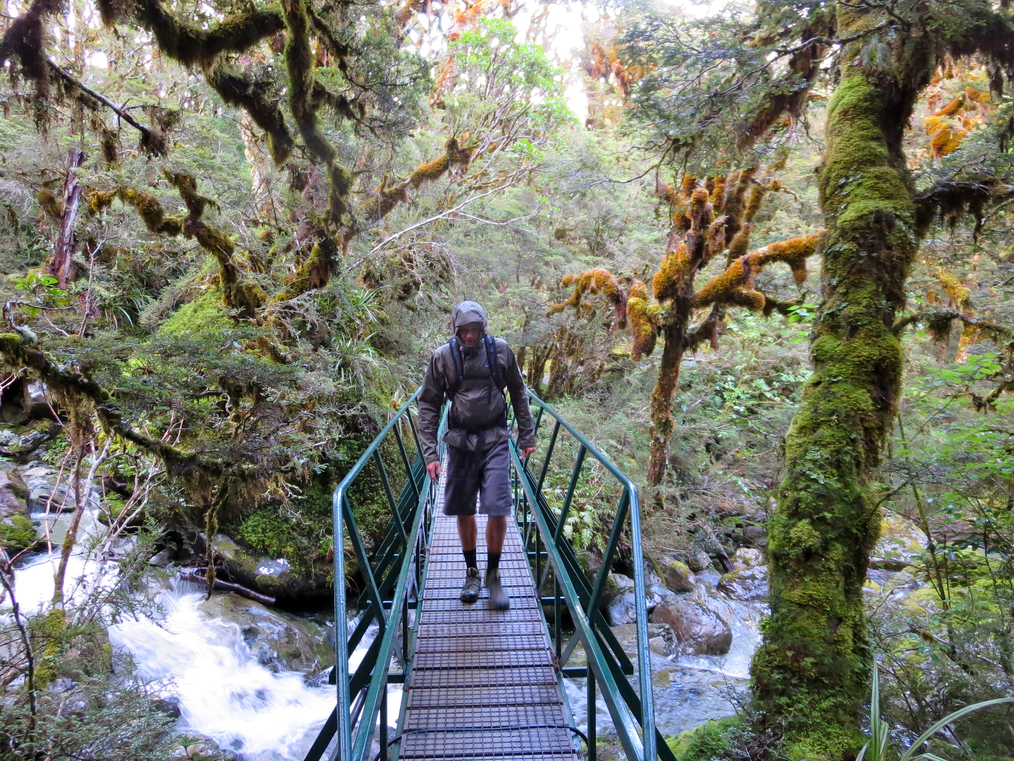 By the time we got parked and on the trail, it was 8AM. The forecast for the day was grim. When we picked up our hut tickets, we were warned it could be blizzard conditions above tree line. No doubt it had snowed quite a bit overnight as fresh snow-covered all the peaks along the road from Milford Sound. It wasn’t raining or snowing as we started the hike.