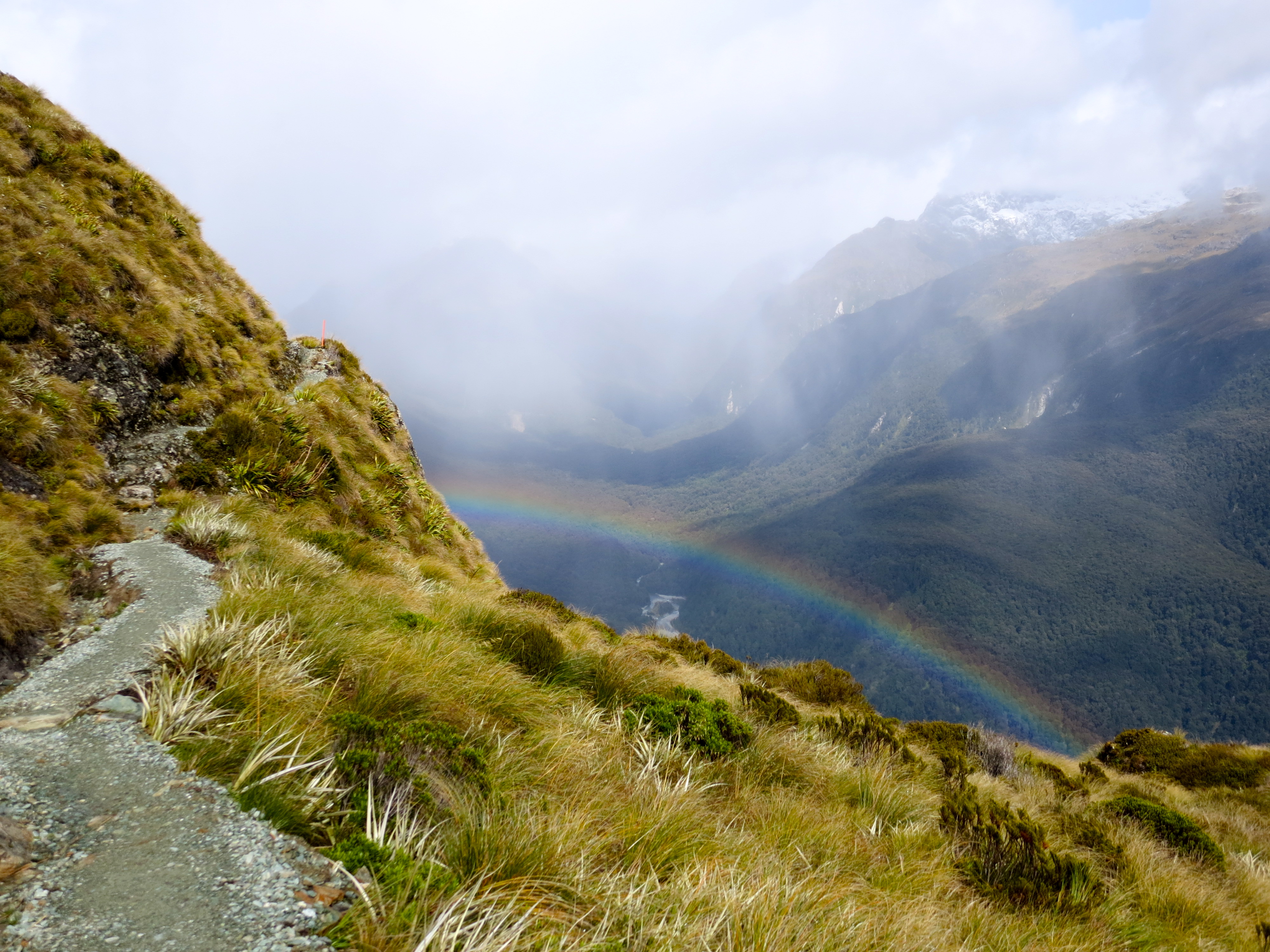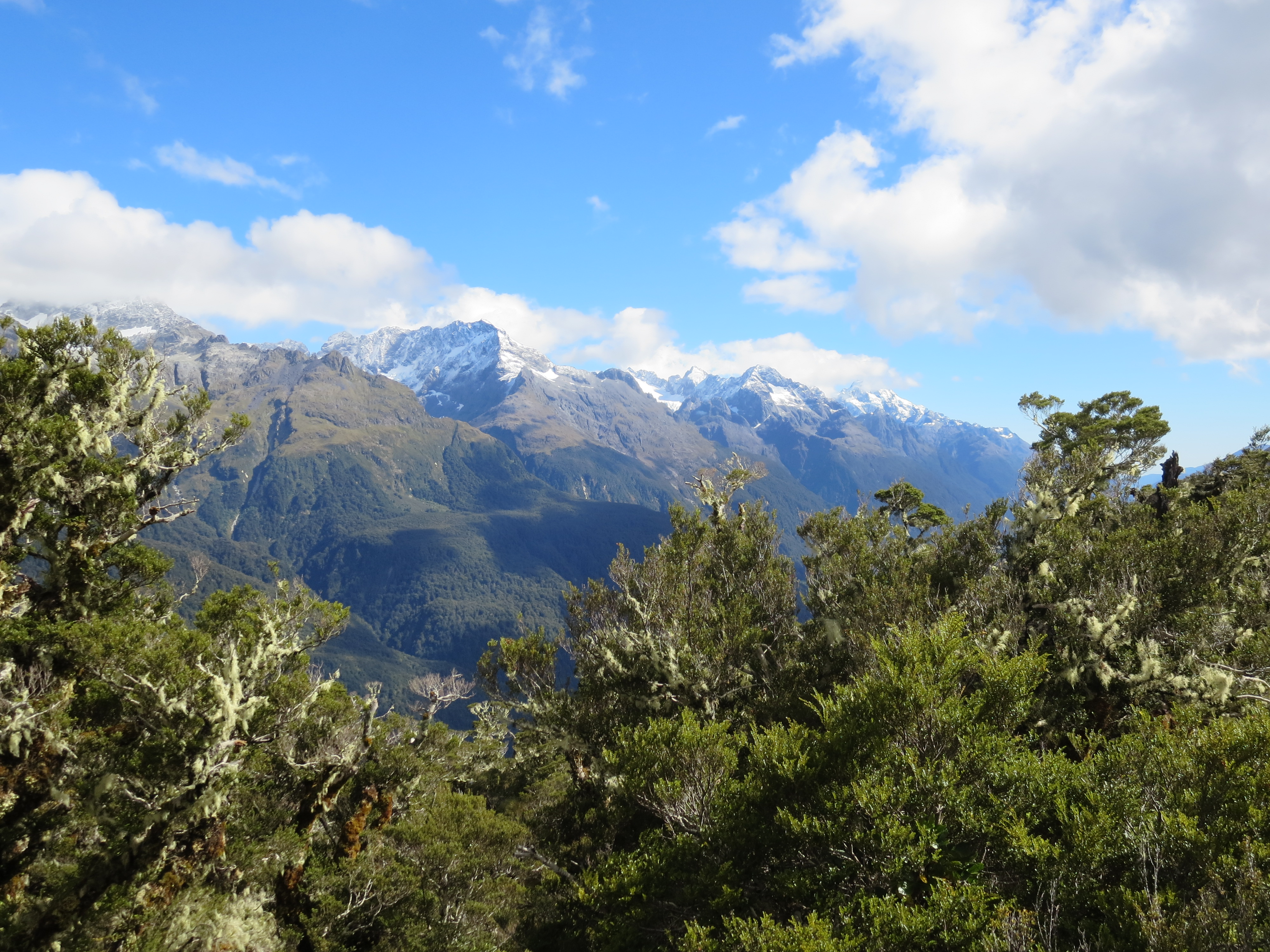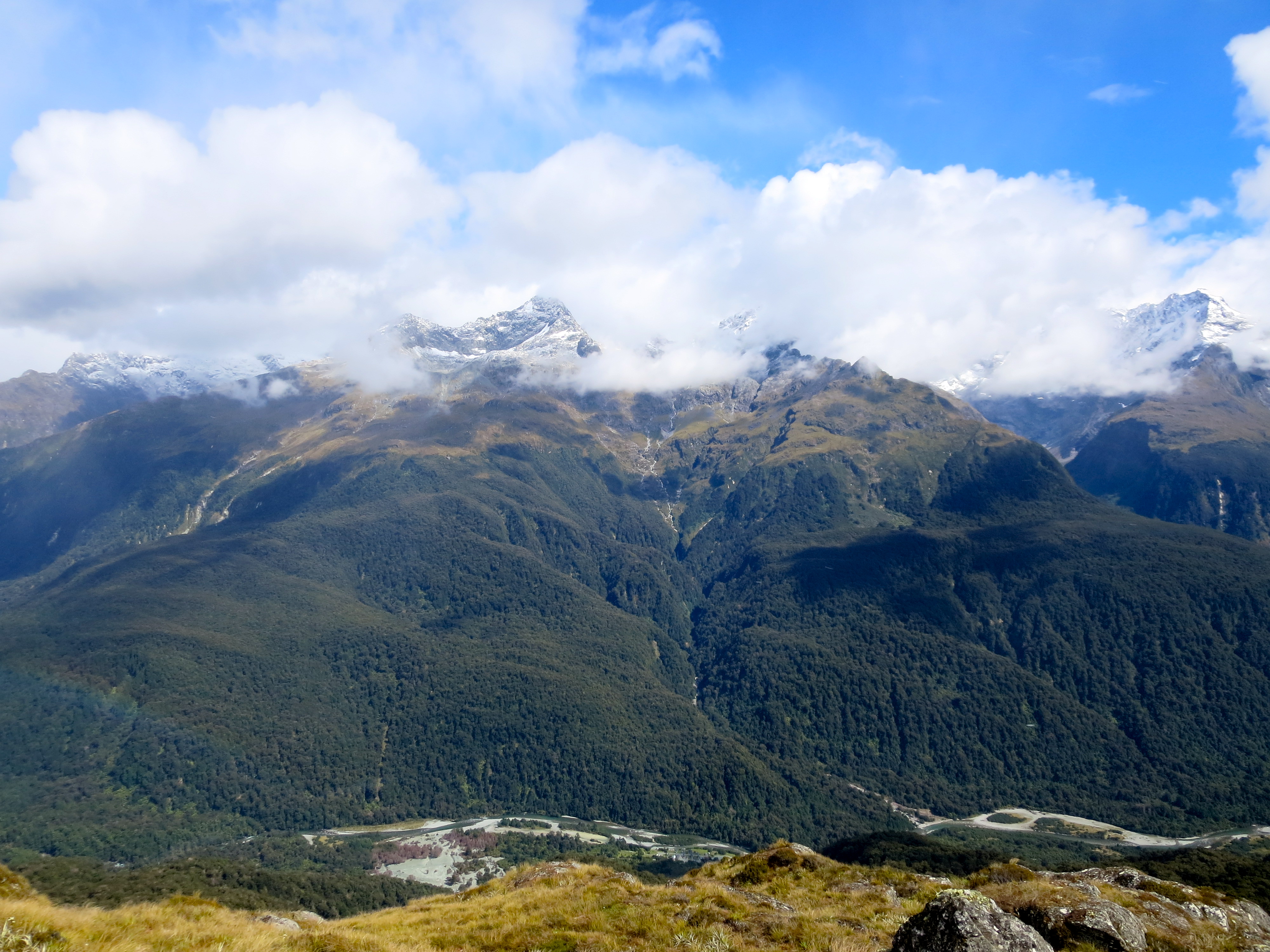 The next section of the hike climbed up to a ridge. There was a long stretch of trail along the exposed Hollyford Face. There were a lot of clouds in the sky, but we still had expansive views of the Darran Mountains.