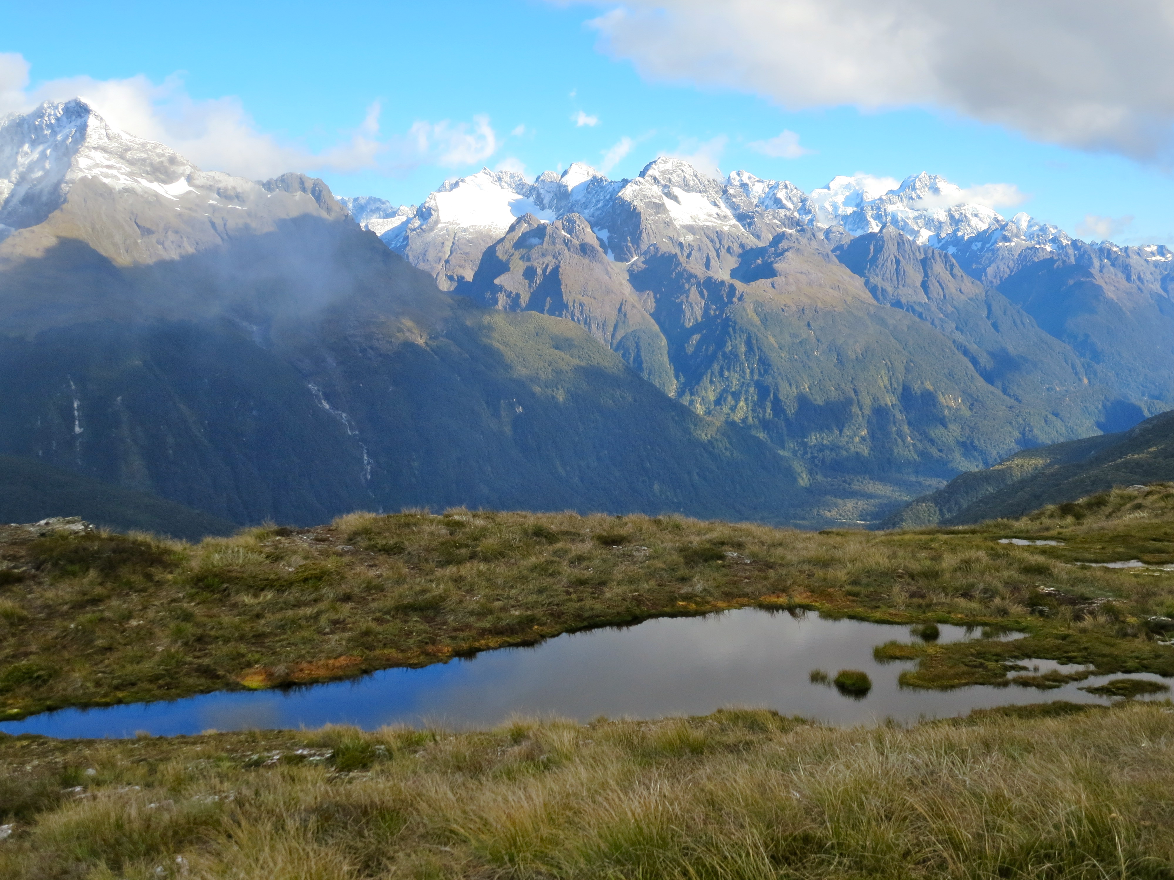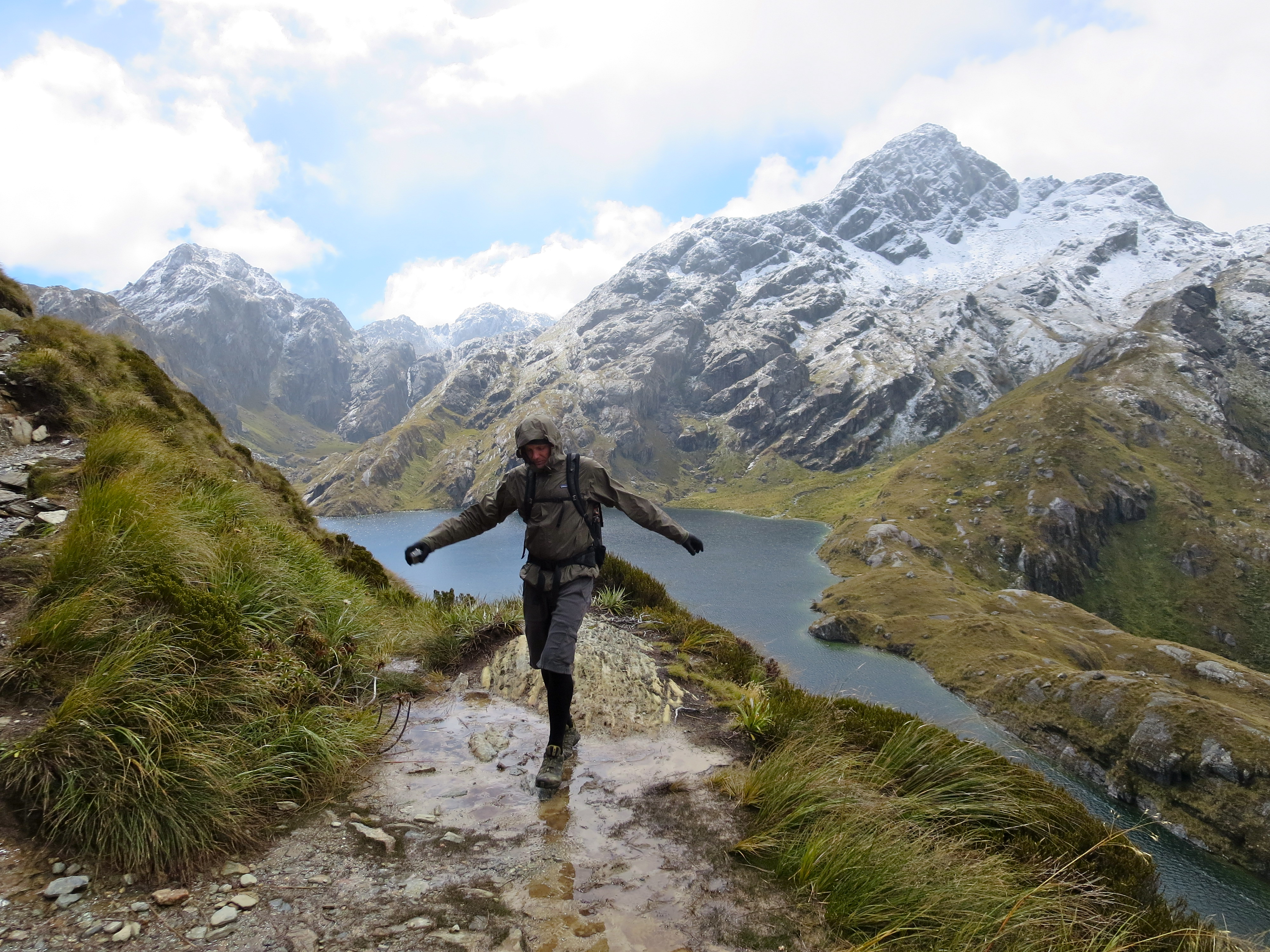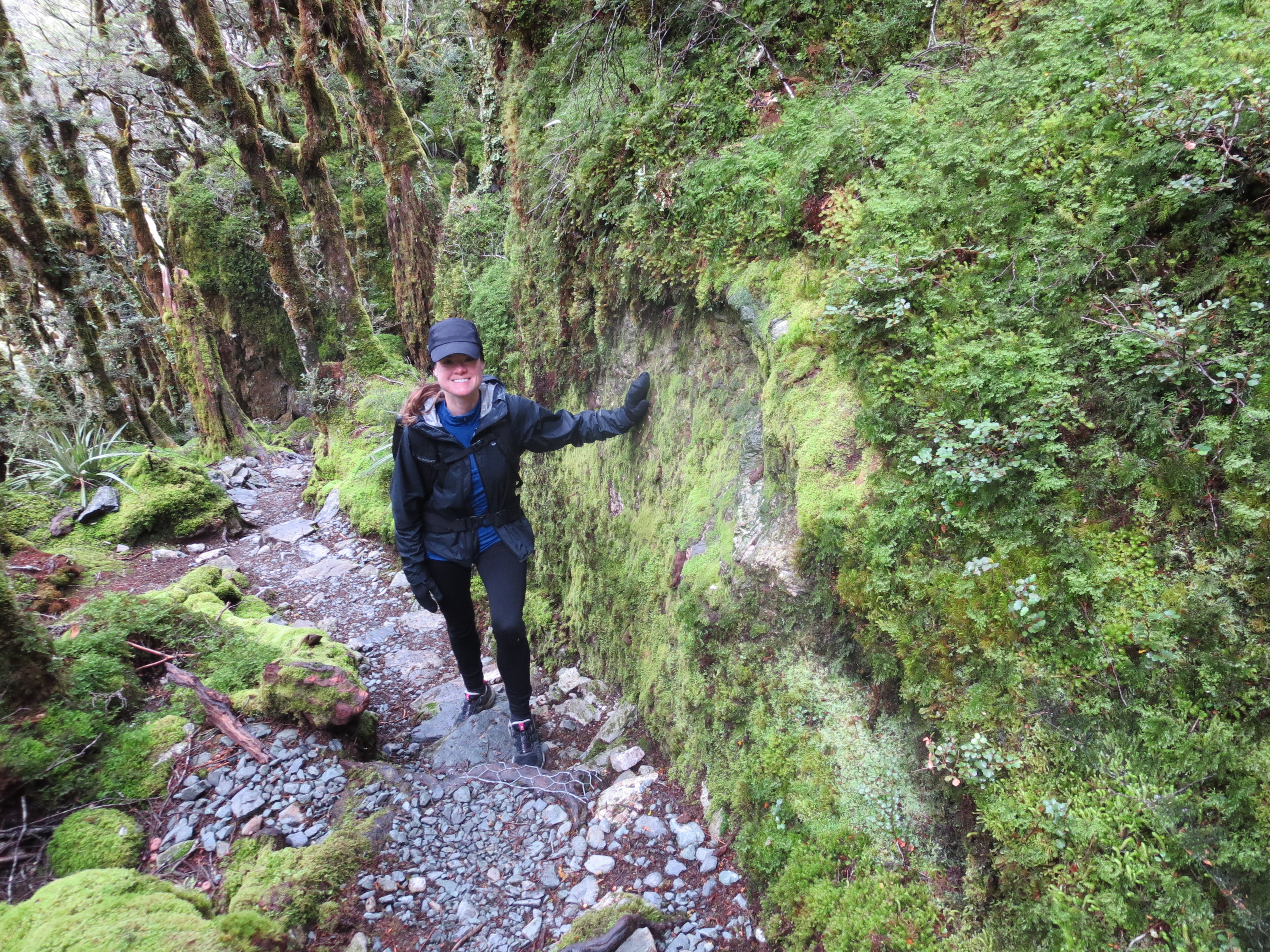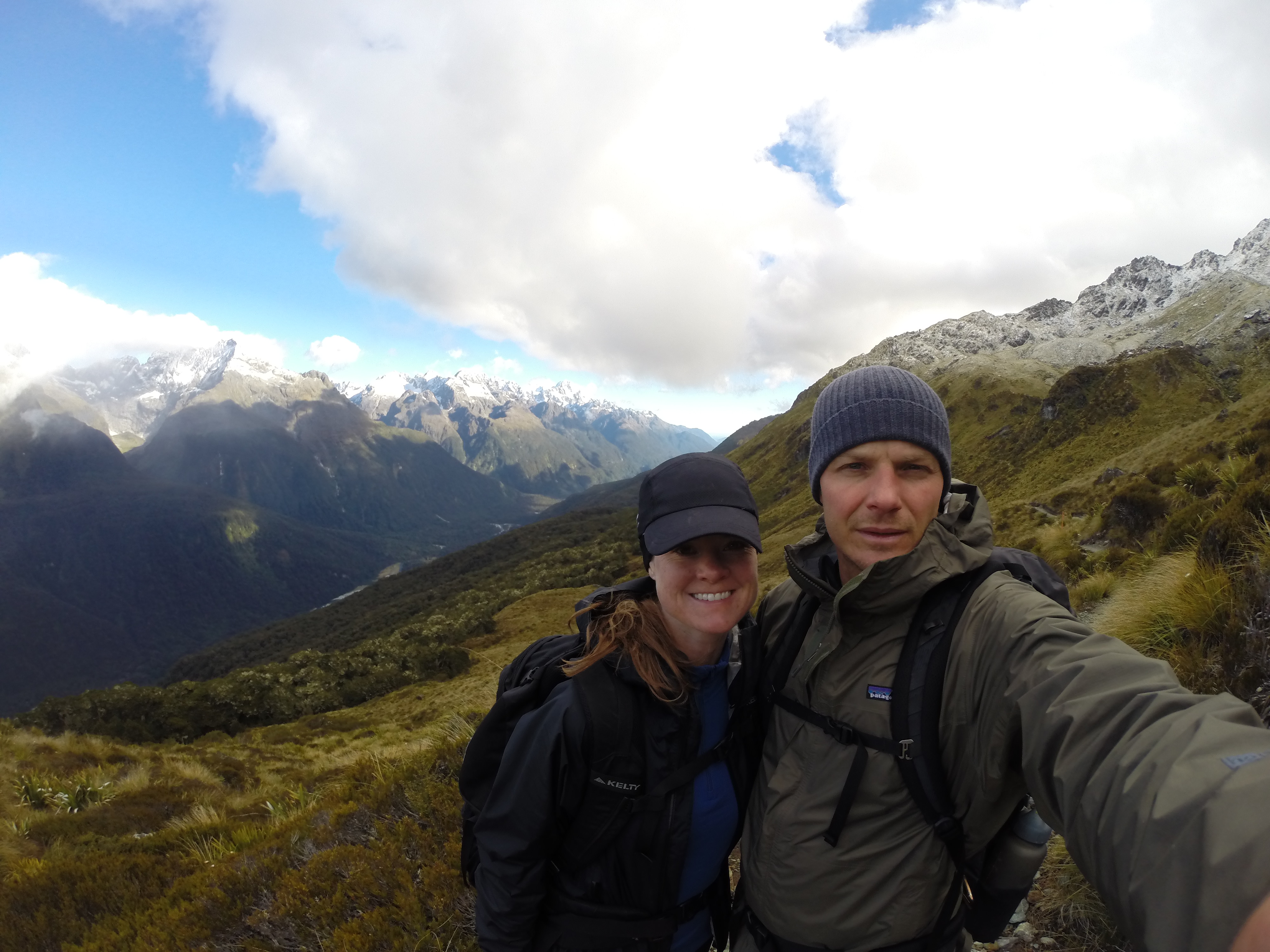The next section of the hike climbed up to a ridge. There was a long stretch of trail along the exposed Hollyford Face. There were a lot of clouds in the sky, but we still had expansive views of the Darran Mountains.