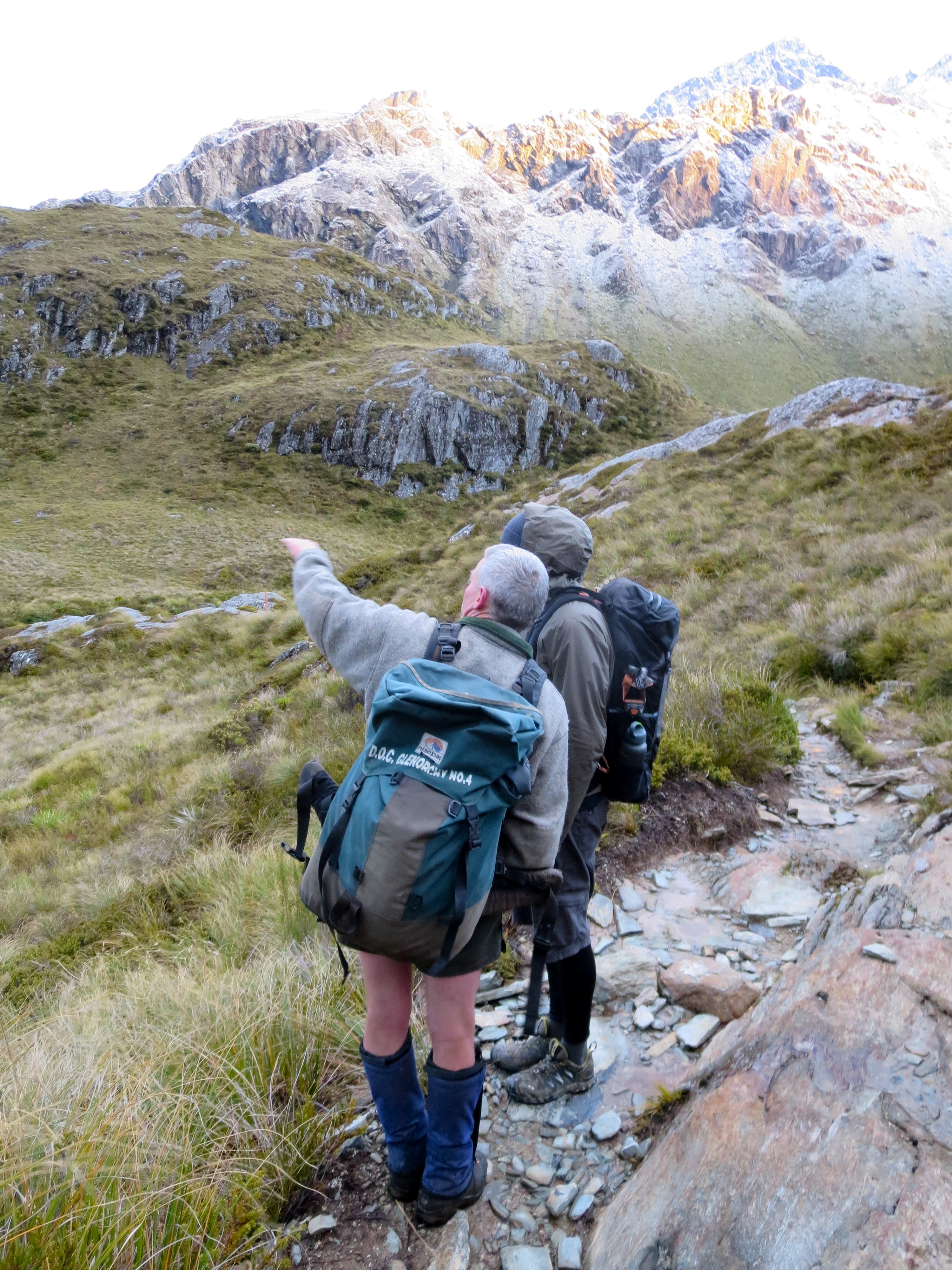 We ran into the hut ranger. He had already been up to the Harris Saddle before the sun came up and was now on his way back to the hut. I was a little surprised to see him wearing shorts, given how cold it was; nonetheless, he is a local and this is their summer. We asked him how much the conditions were higher up. He looked at what we were wearing and said we would be fine. We chatted with him for a bit and he gave us some insight into the landscape around us and pointed out some of the native plants.