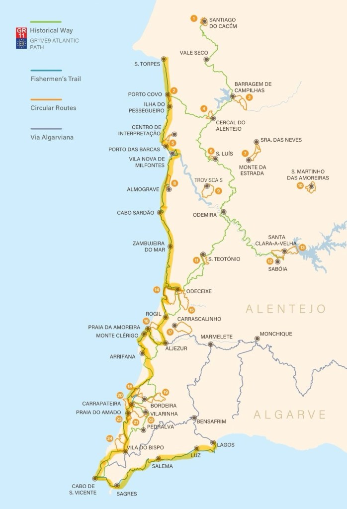 The following map shows the full route for the Fisherman’s Trail. We completed it in 11 days (11-13 days is most common). The original Fisherman’s Trail is much shorter (Porto Covo to Odeceixe) and can be completed in 4 days. Many people still do the original route only.